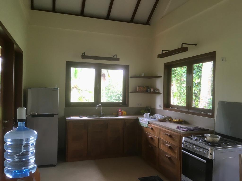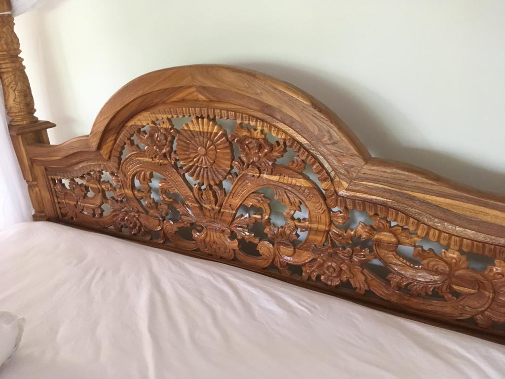 The kitchen, with art-deco dining table and teak cupboards, has a large fridge with freezer compartment, a microwave, drinking water dispenser and a gas cooker with an oven. Basic cooking utensils are supplied.
