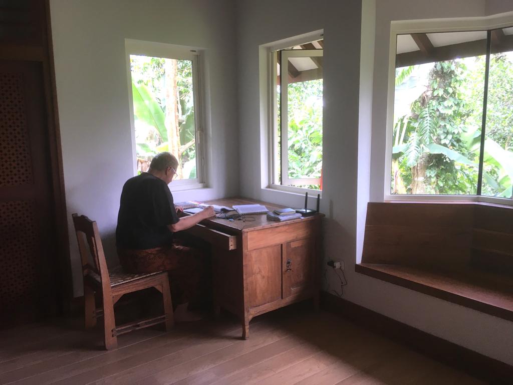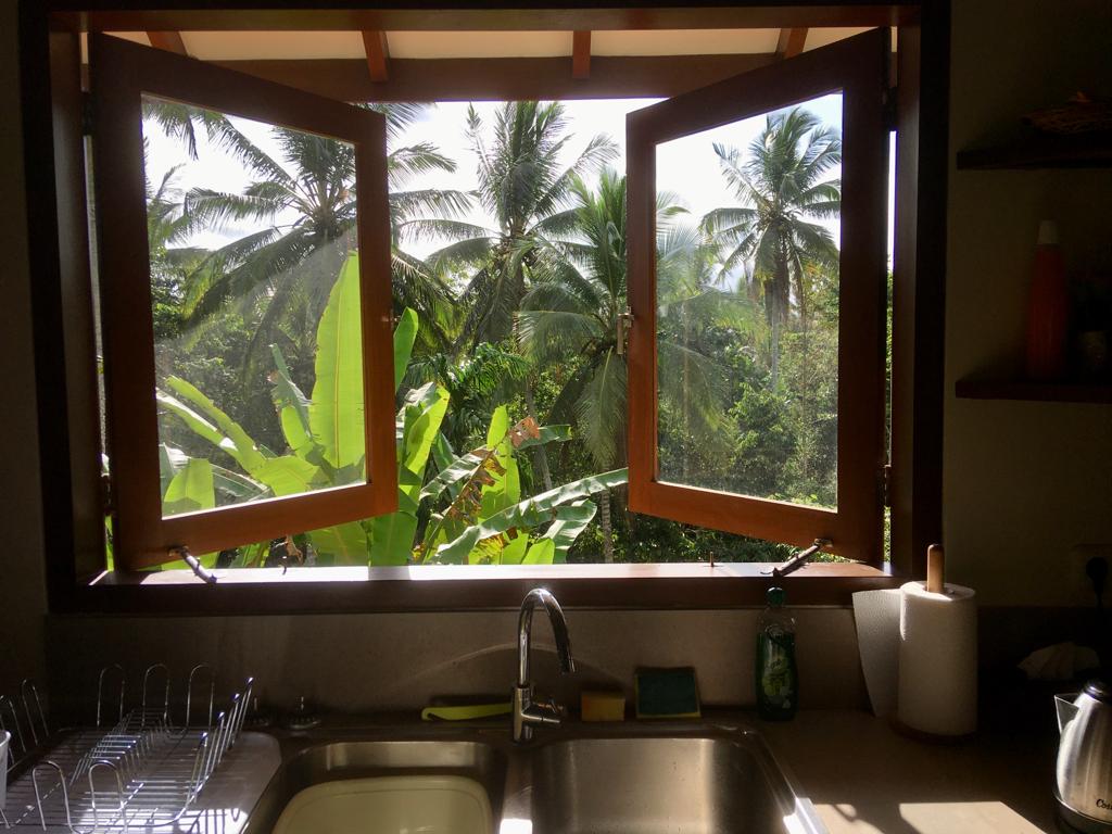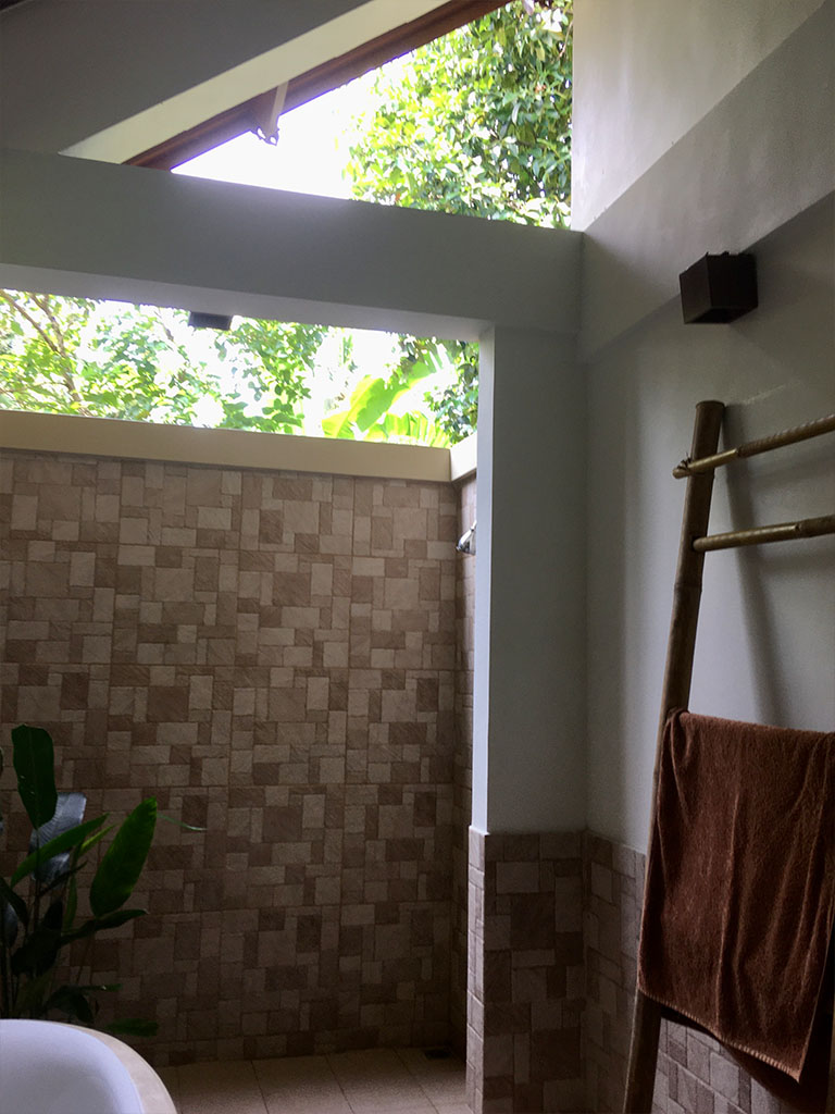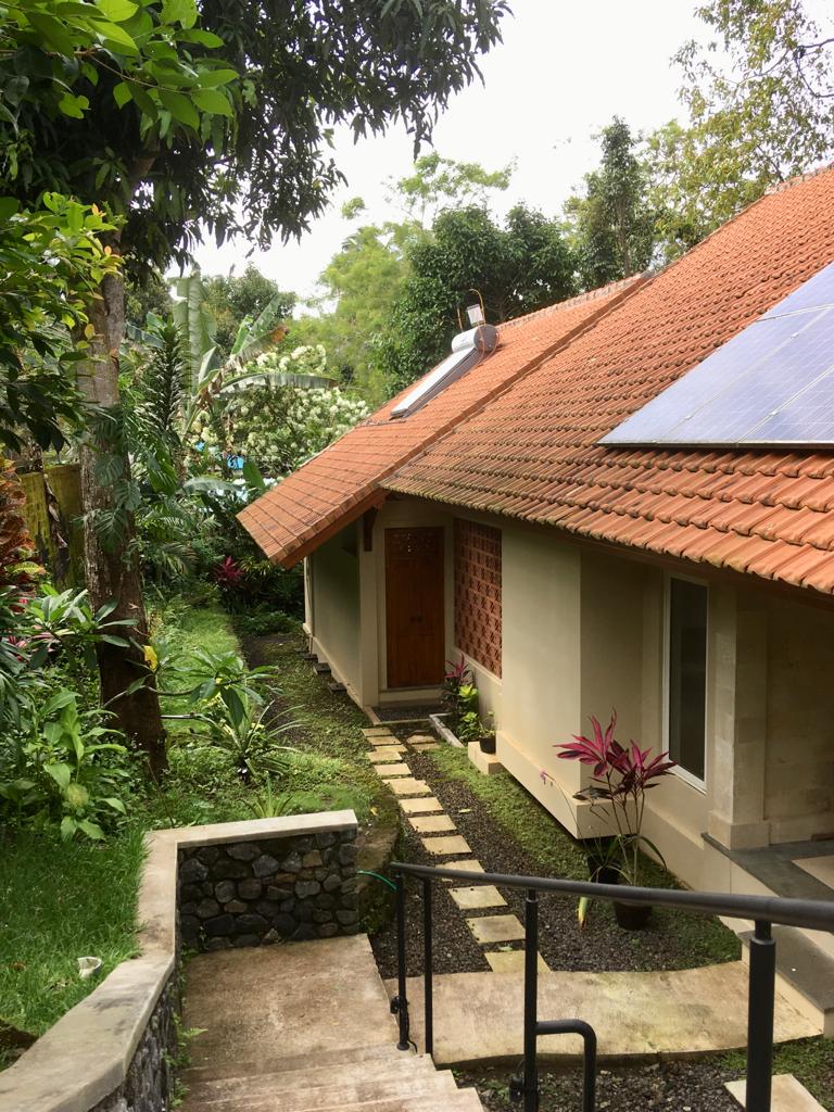 Pondok Candra, was completed in 2022, and is a modern eco-house with solar technology, an 80-metre well and a bio-septic tank, set in a large, tranquil, tropical garden sloping down to a river. It combines features of European and Balinese architecture, and sleeps a maximum of four.