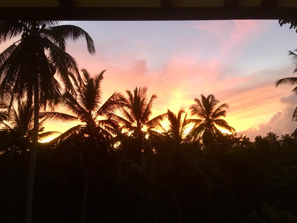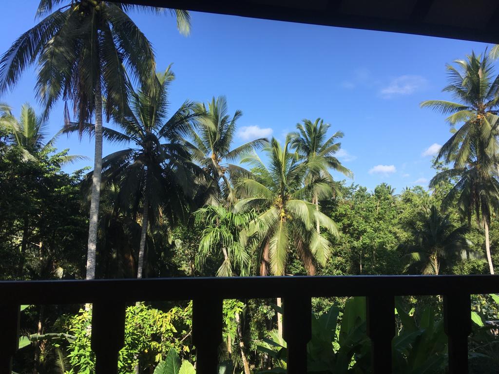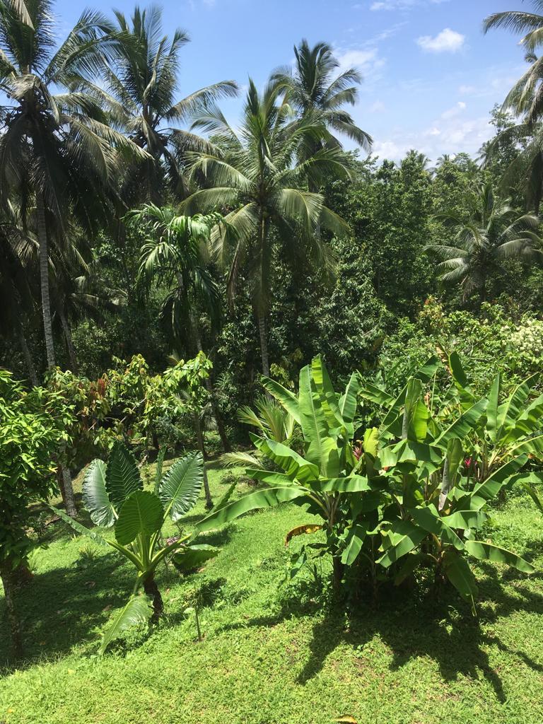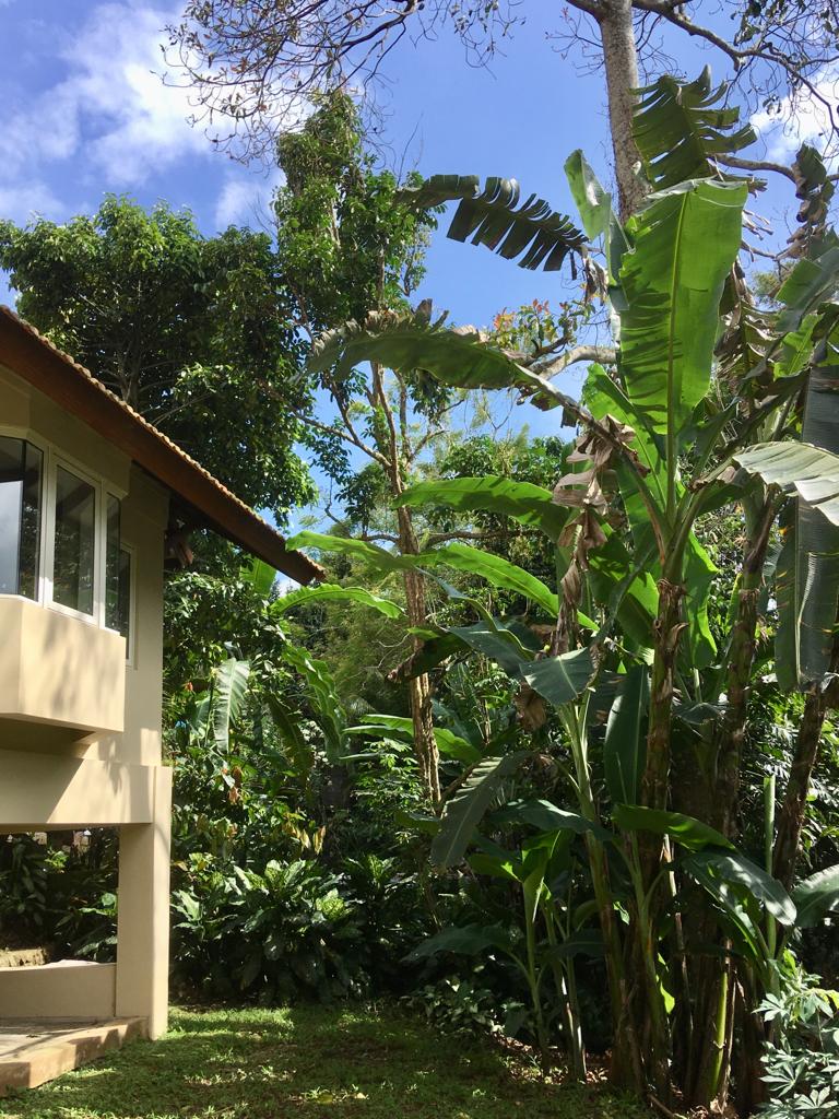The large master bedroom, which also comprises an antique desk with a view of the garden, and the living-room with gallery open onto a sheltered veranda with an unbroken view of the lush garden. You can see coconuts, bananas, pineapples and passionfruit from the windows and enjoy the heady scent of the Ylang-ylang tree and the calming sound of the river. The veranda is equipped with comfortable recliners and an antique round dining table.